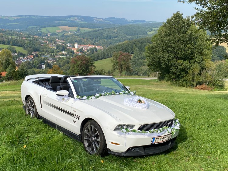 Dieser Mustang ist ein Traum in Weiß. Er vermittelt wunderbar den American Way of Life. Der Fond ist groß genug für das Brautpaar. Sie werden sich über tolle Hochzeitsfotos und unvergessliche Urlaubstage danach freuen.