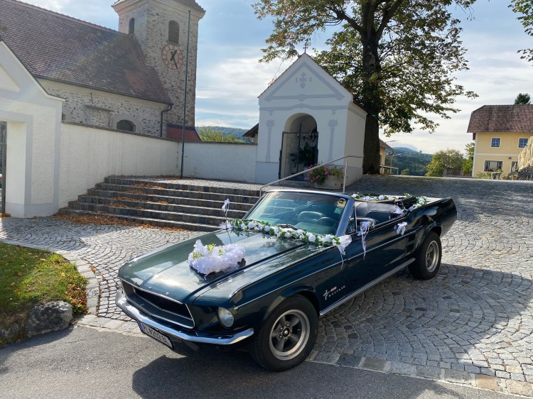 Das Brautauto, über das alle reden werden. Der 67er– Mustang ist nicht nur ein legendärer Sportwagenklassiker, sondern bietet auch einen erstaunlich geräumigen Fond. Perfekt für die Inszenierung für der Kirche oder beim Standesamt.