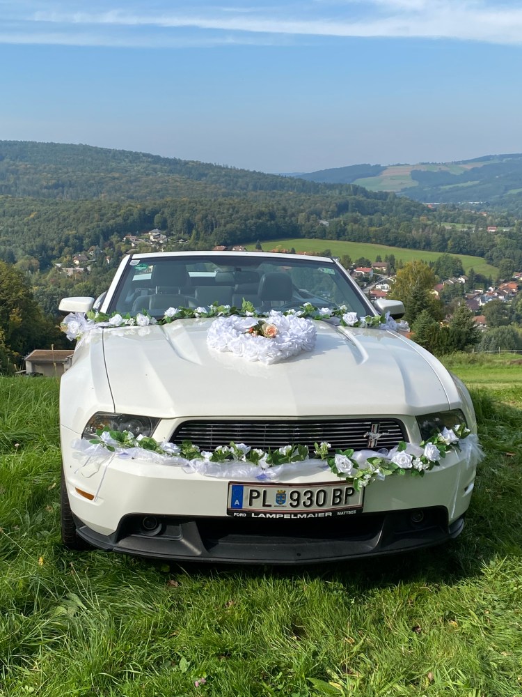 Dieser Mustang ist ein Traum in Weiß. Er vermittelt wunderbar den American Way of Life. Der Fond ist groß genug für das Brautpaar. Sie werden sich über tolle Hochzeitsfotos und unvergessliche Urlaubstage danach freuen.